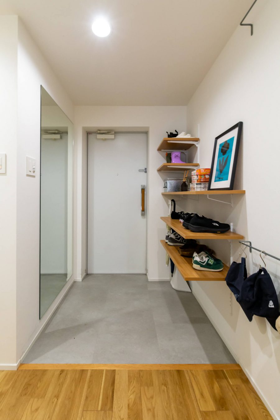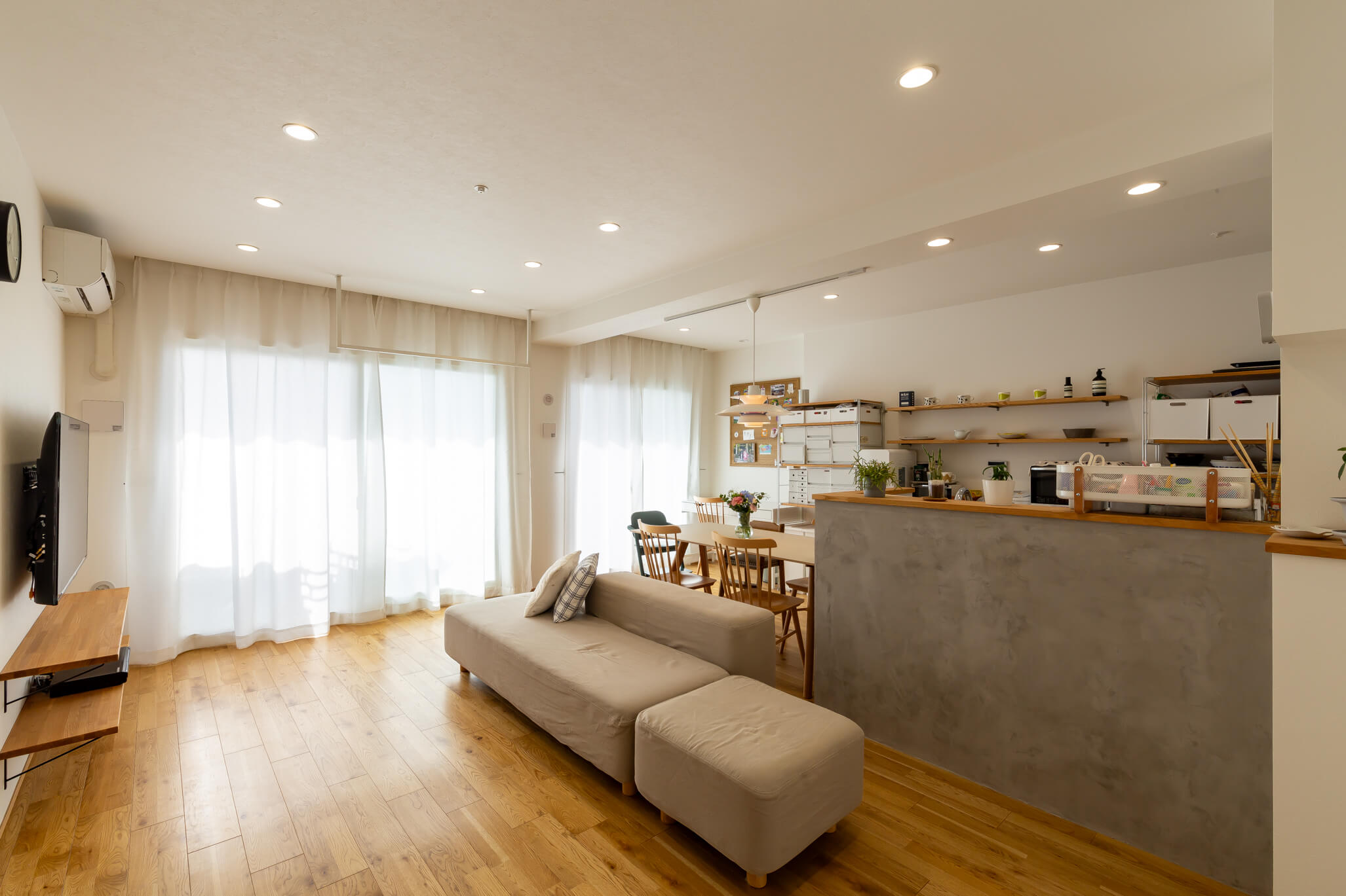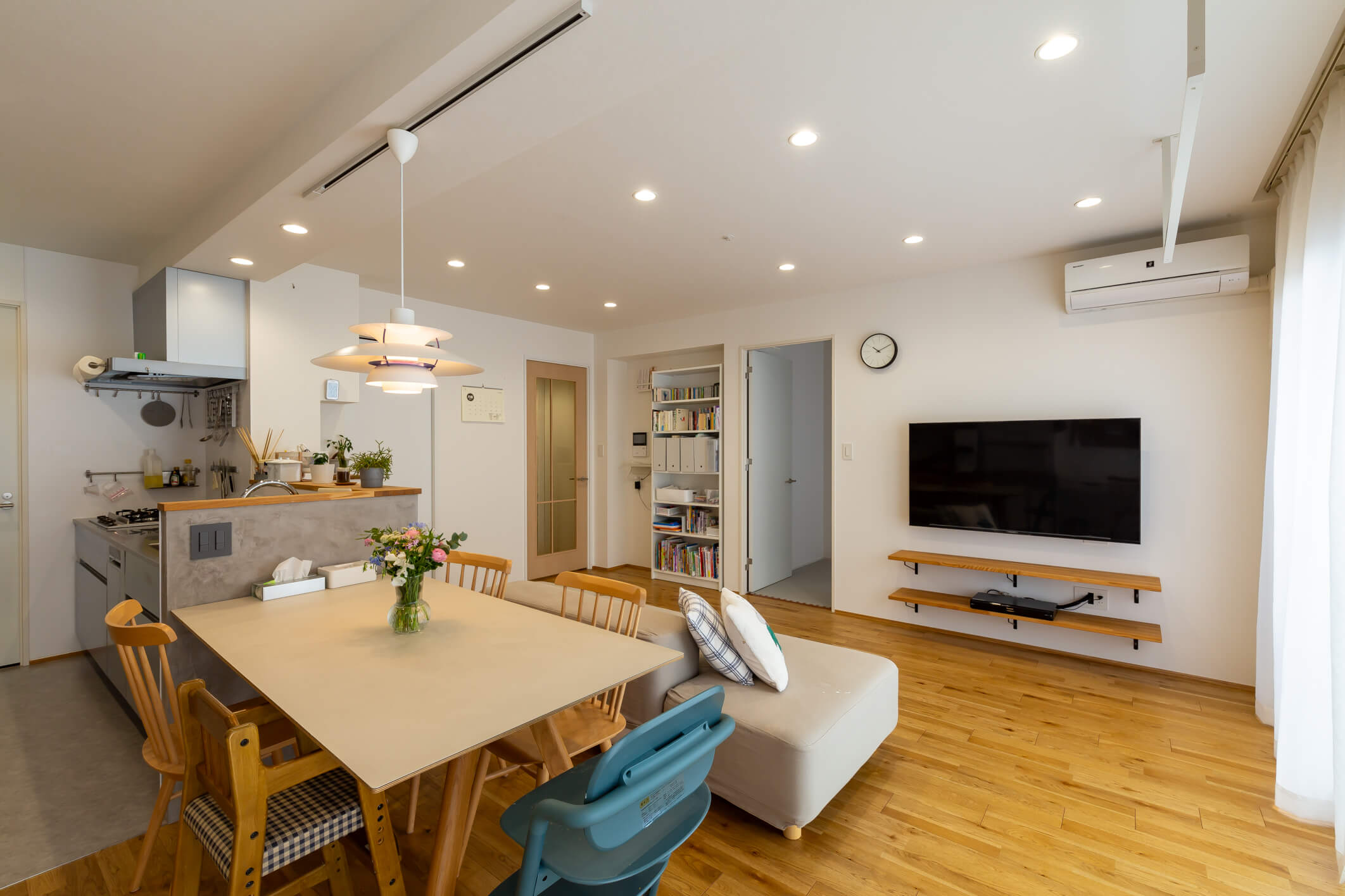 ライフスタイルの変化を期に、お住み替えを決意されたお客様。 初回打合せ時からリノベーションに対する期待が高く、イメージや参考画像をたくさん共有していただき、お客様の要望を組み込みながら暮らしやすい住まいづくりをサポートさせていただきました。 今回はご購入されたお住まいの既存部分を生かしながらのリノベーションとなり、間取り変更の制約も多くありました。そんな中お住まいに対するご要望の優先順位を明確にし、お客様の譲れないこだわりポイントを整理しながら打ち合わせを進めました。 ・和室を無くして14畳のLDKに拡大 ・3畳L型のクローズキッチン → 使いやすさを追求してオープン対面キッチンへ そのほかにも、リビング中心にファミリークロークを設けて、各部屋へアクセスがしやすい導線となっています。 壁紙は白をベースに、シンプルでありながら床や棚板の木の素材感を生かした温かみのある印象にまとめ、家具やインテリアがアクセントとして際立つ空間となりました。 設置予定の家具も事前に共有いただき、通路幅や設置幅の寸法を図面上で確認しながらレイアウトを行うことで、お客様に安心感を持ってお打ち合わせさせていただくことができたと思います。 お引渡し後も何度かお住まいにお伺いさせていただきましたが、こちらのご提案以上に素敵なお住まいとして暮らしていただき、私自身もとても嬉しく感じています。