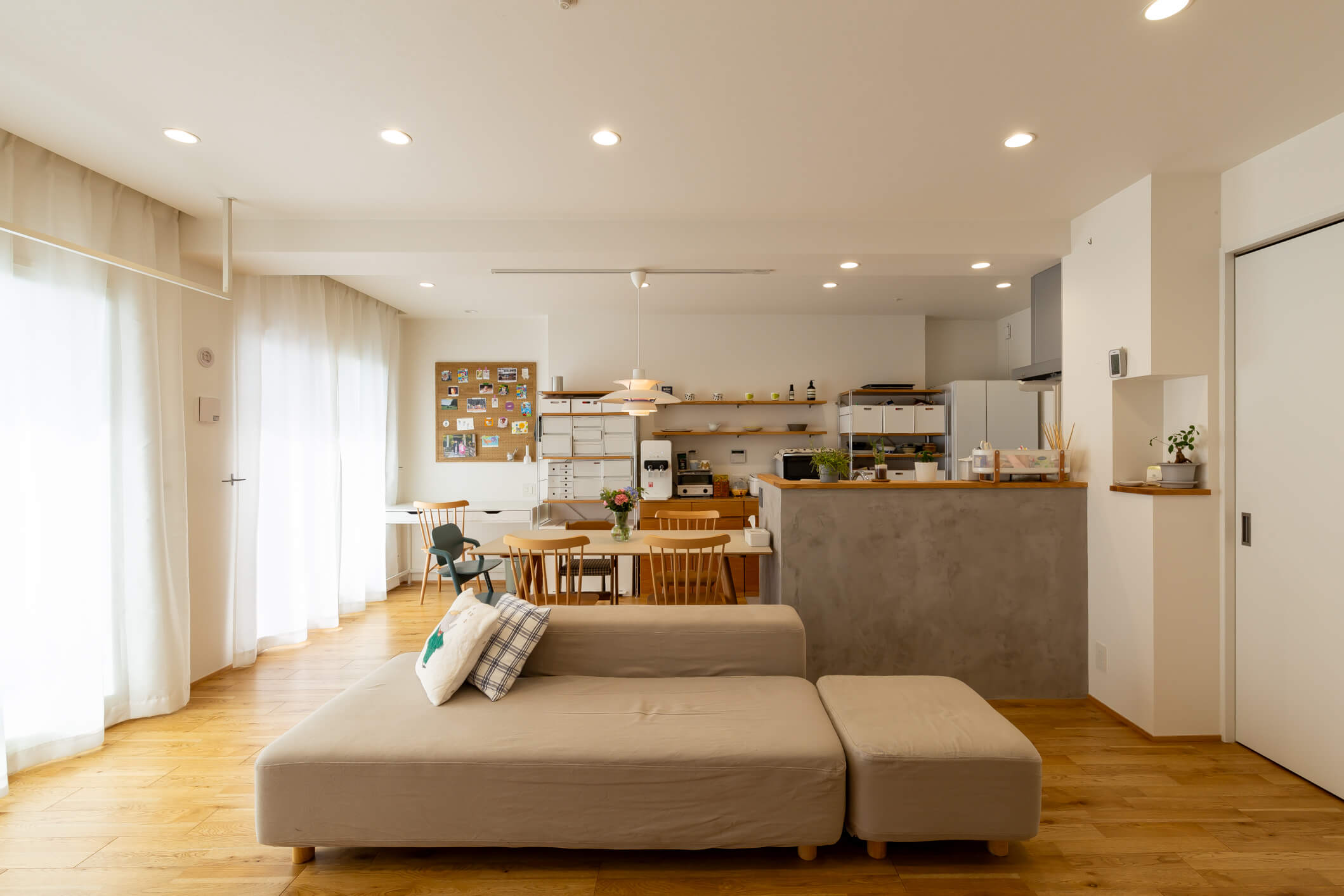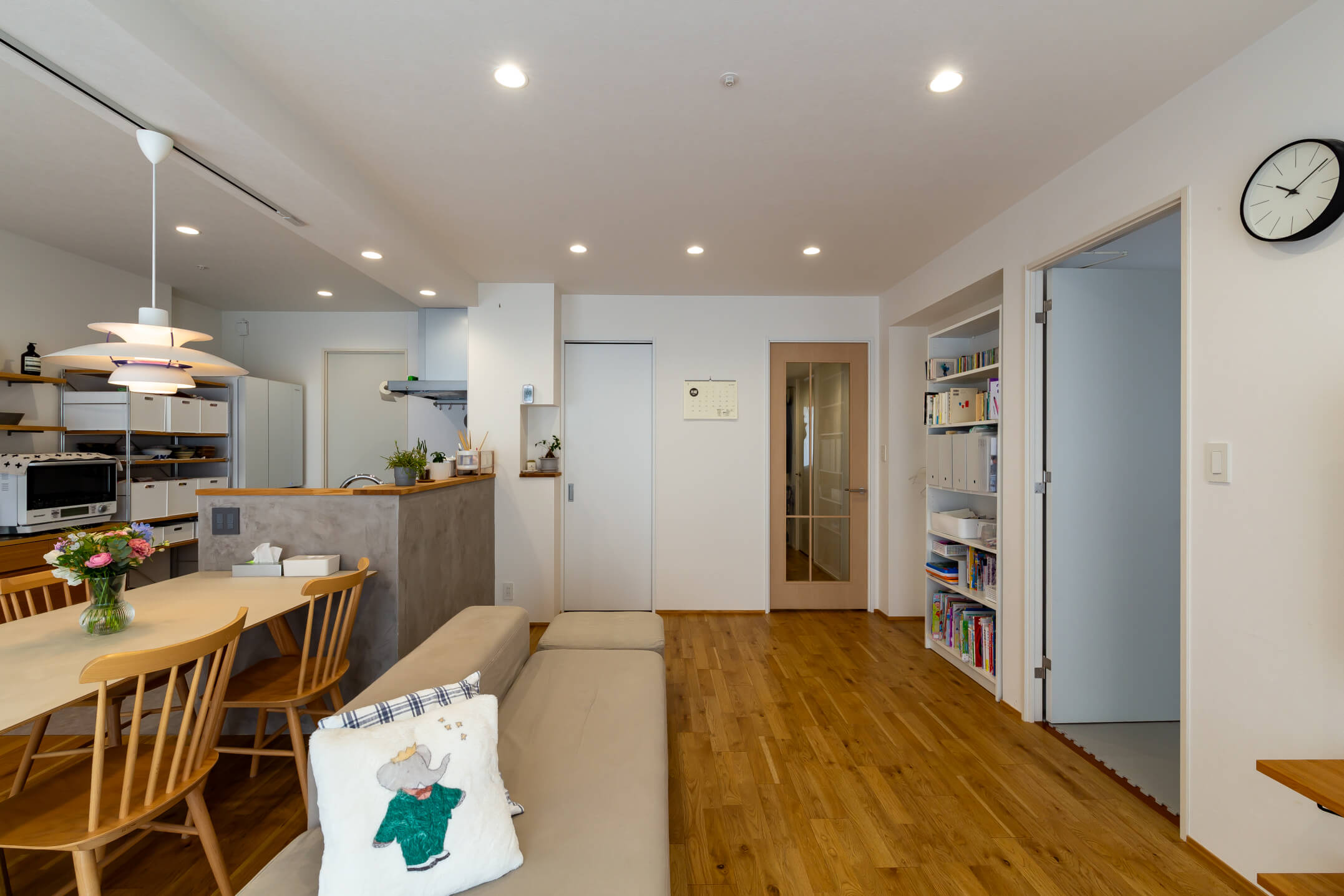 日差しが入りやすく、明るく開放的なマンション。 比較的築浅で、安心安全のオートロックと宅配ボックスを完備。 最寄駅やスーパー、商業施設にもほど近い便利な立地です。 お部屋は白ベースに、グレーとオーク材を加え シンプルでありながら温かみのある空間へ。 緩やかに家族をつなぐ、開放的で居心地の良い住まいとなりました。