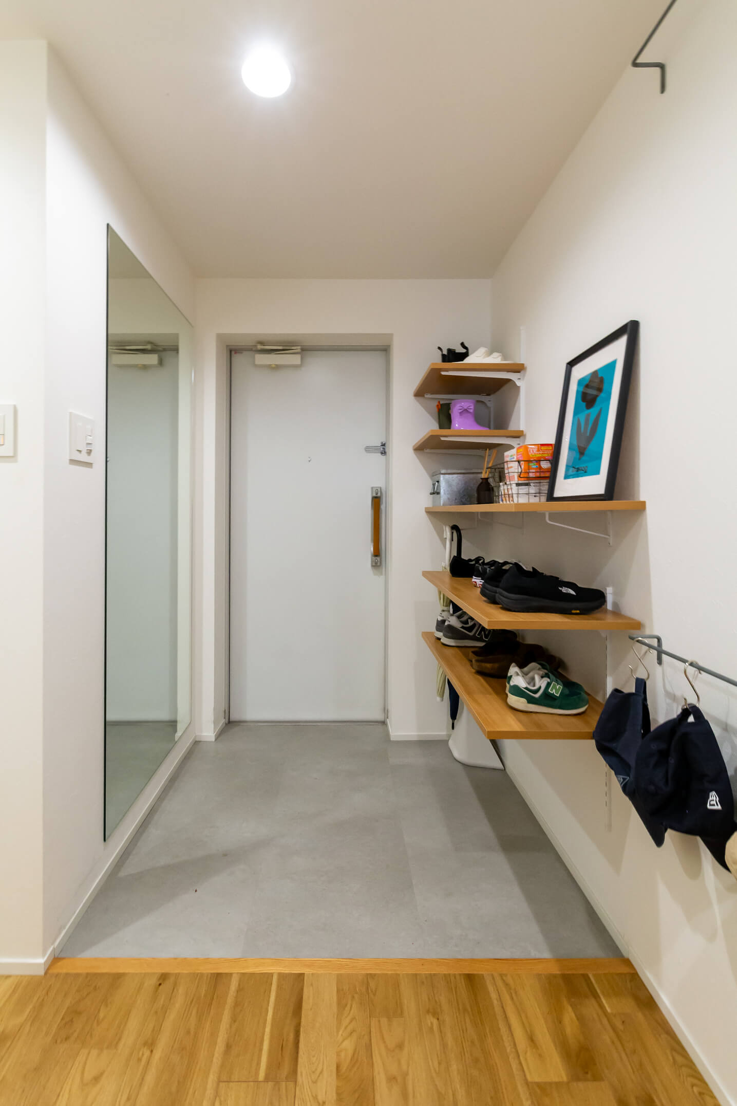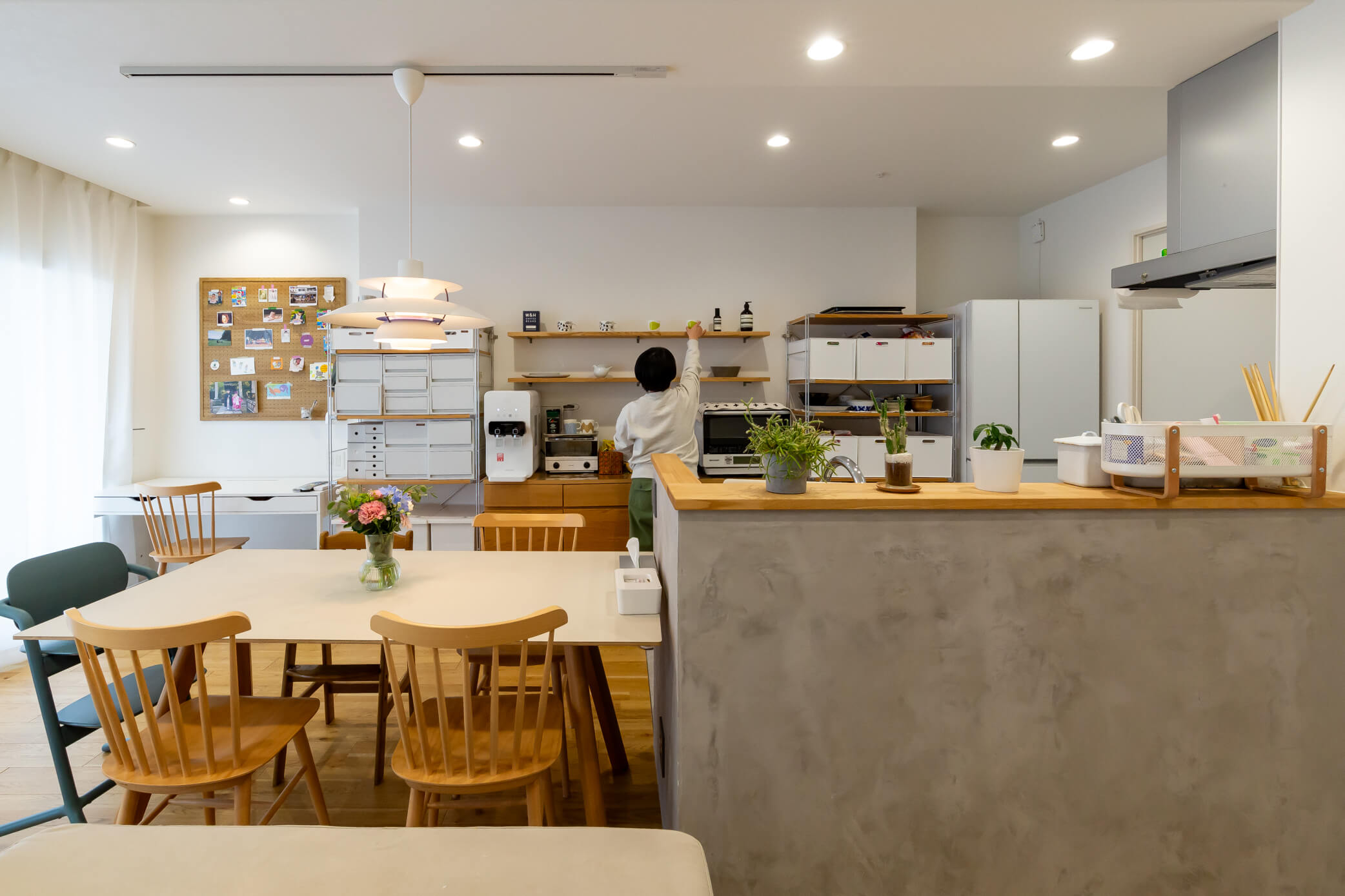壁紙は白をベースに、シンプルでありながら床や棚板の木の素材感を生かした温かみのある印象にまとめ、家具やインテリアがアクセントとして際立つ空間となりました。