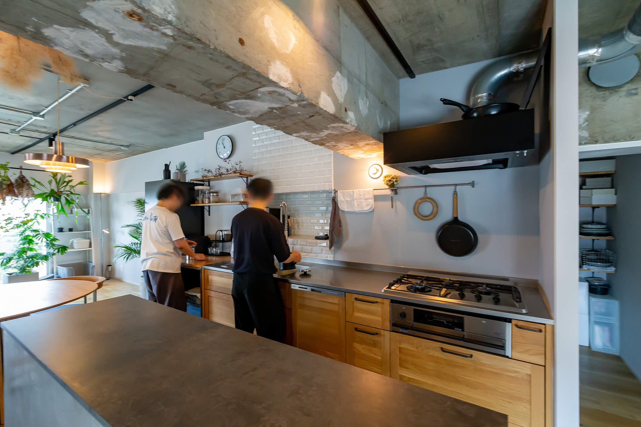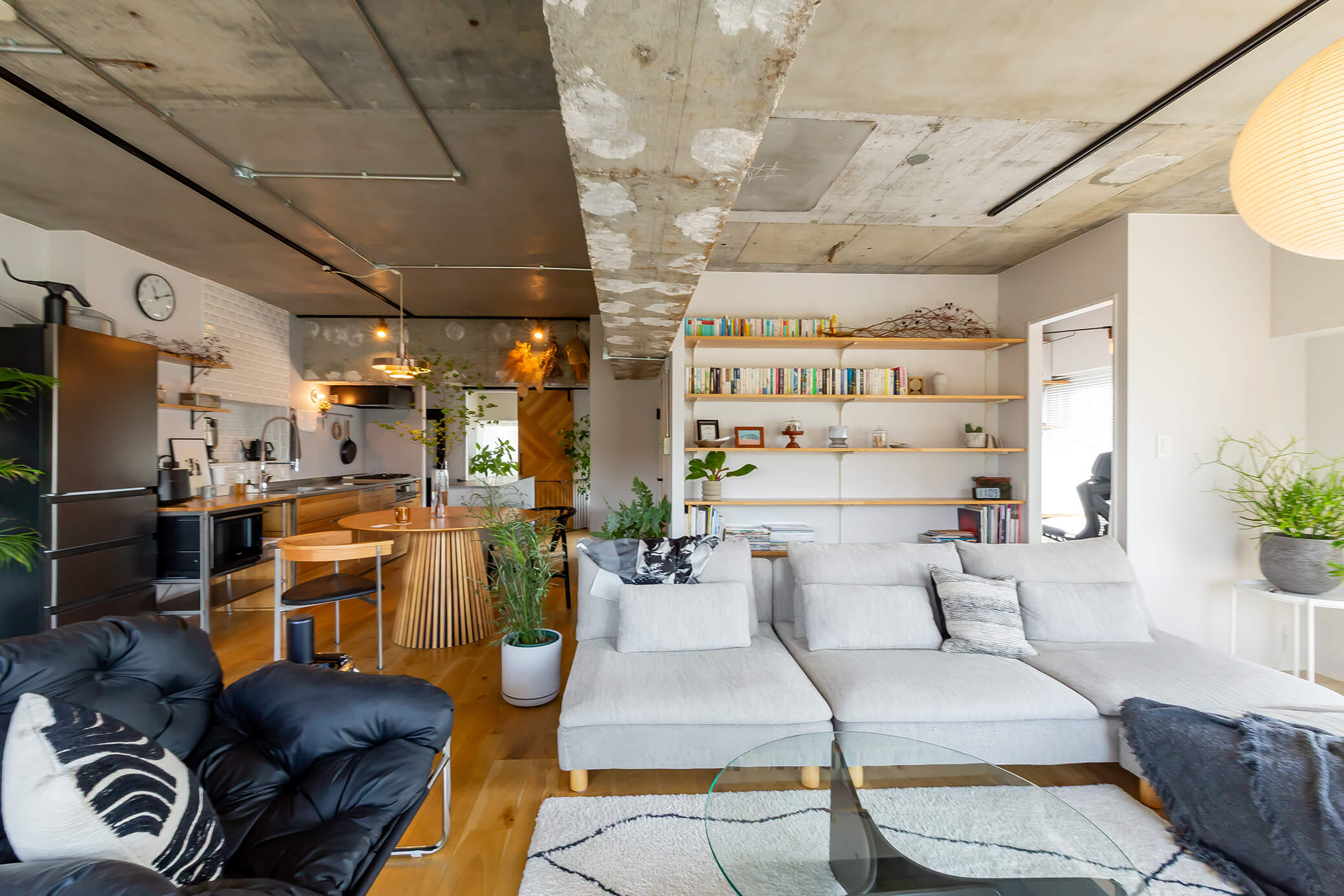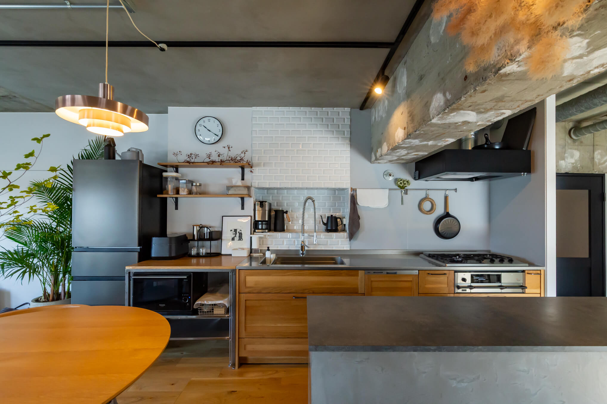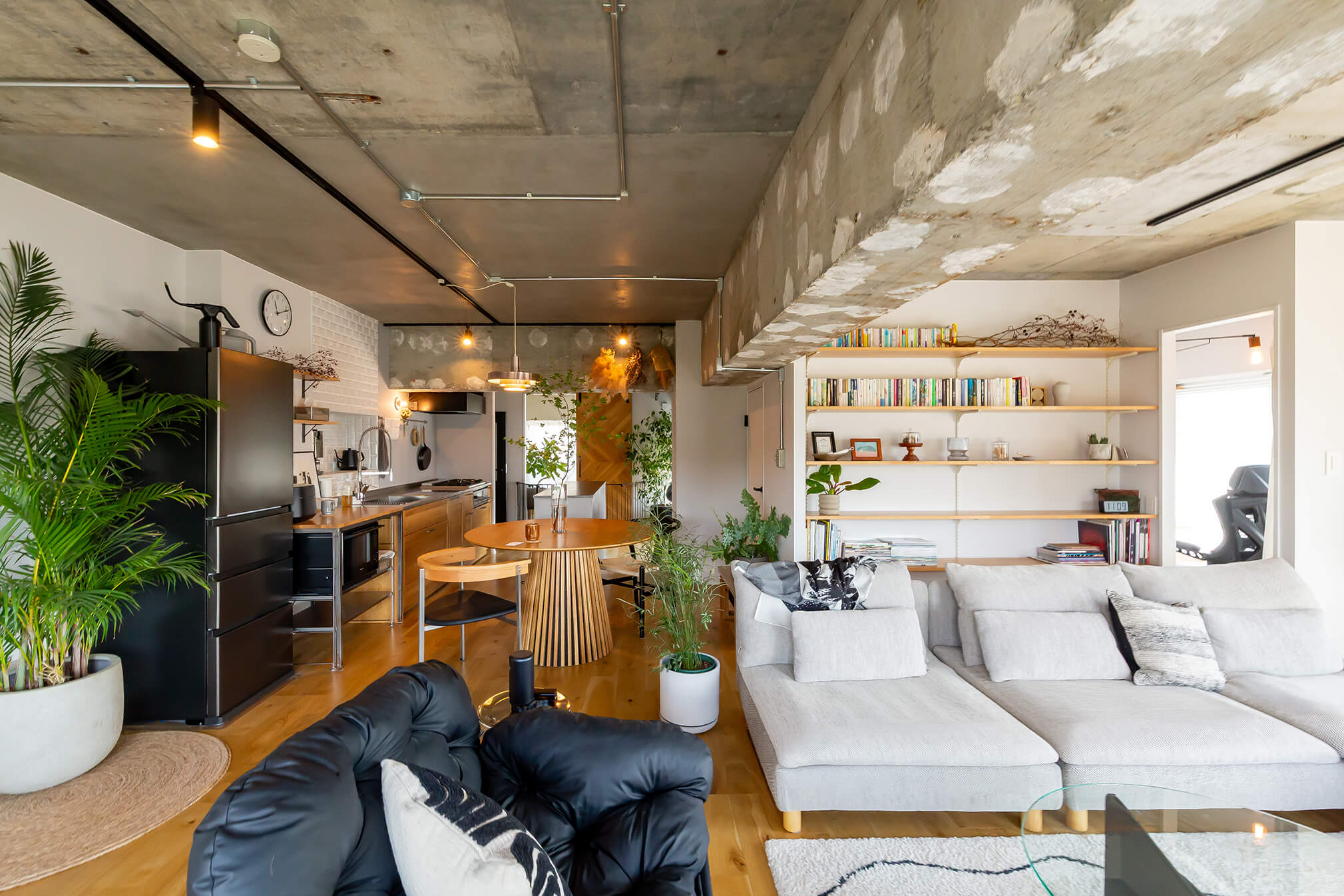 天井や梁をあえて仕上げずに残したコンクリートや露出配管がラフで無骨な雰囲気をつくり、そこにフローリングや木目のキッチンを組み合わせることで温かみをプラス。