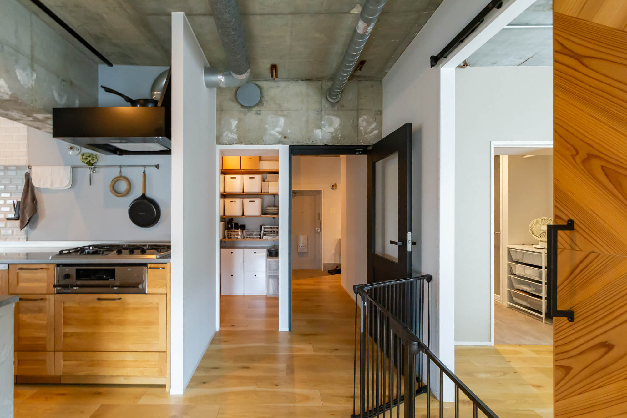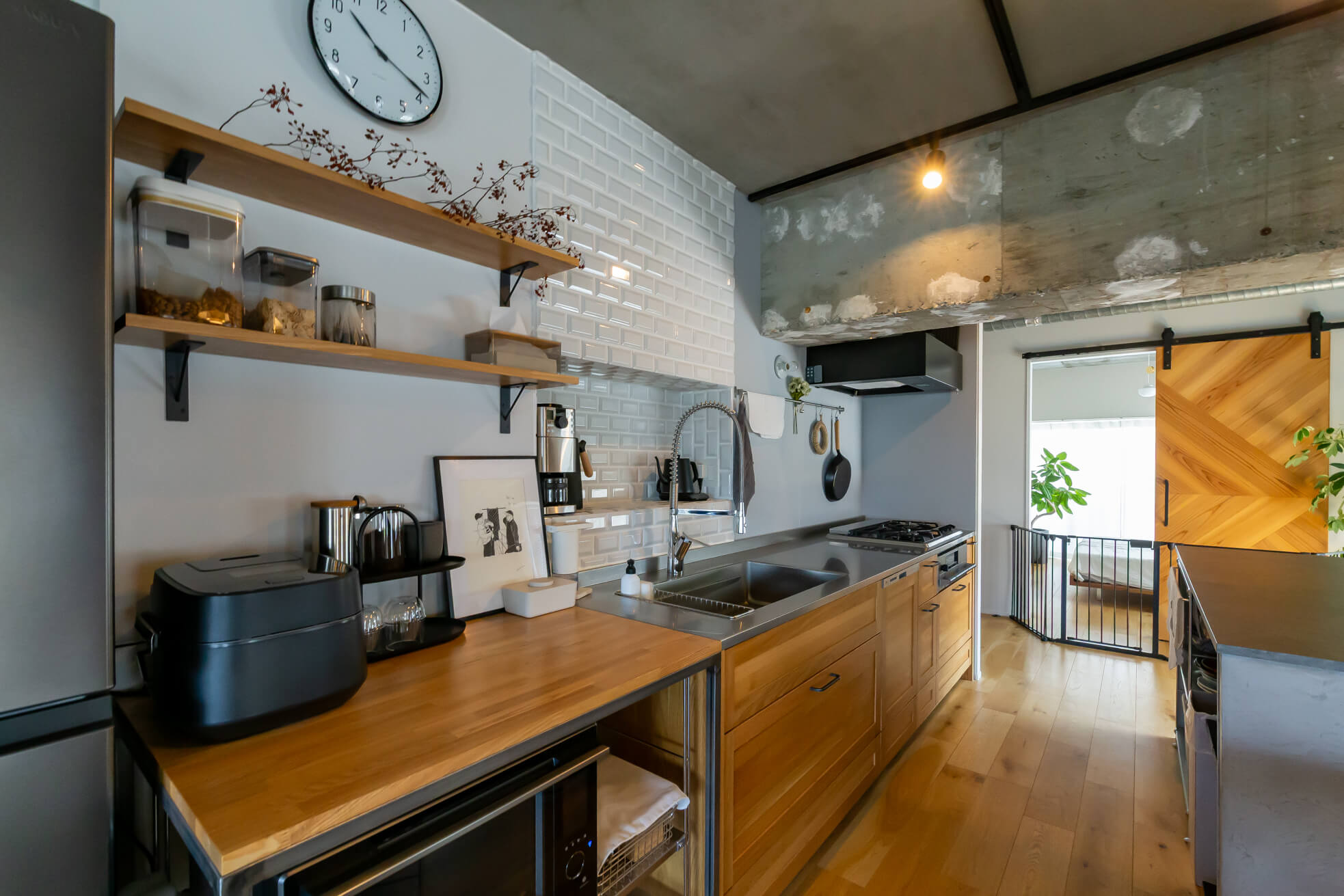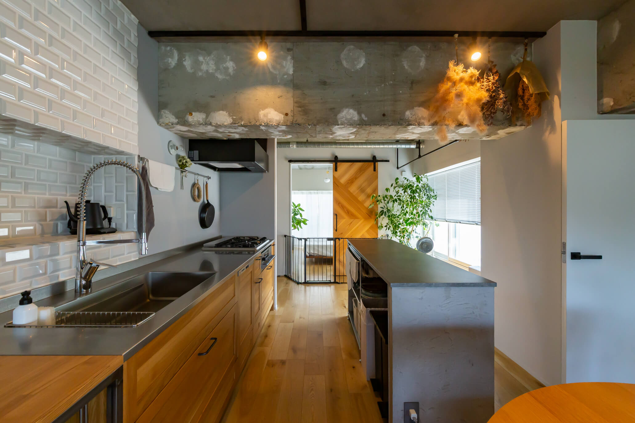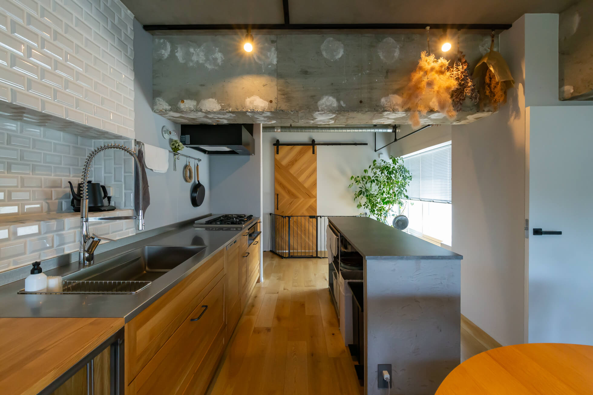 天井や梁をあえて仕上げずに残したコンクリートや露出配管がラフで無骨な雰囲気をつくり、そこにフローリングや木目のキッチンを組み合わせることで温かみをプラス。