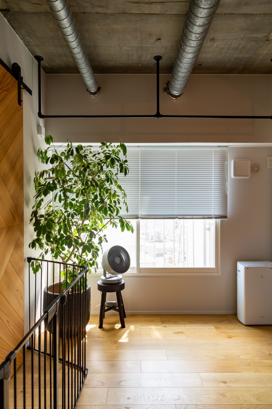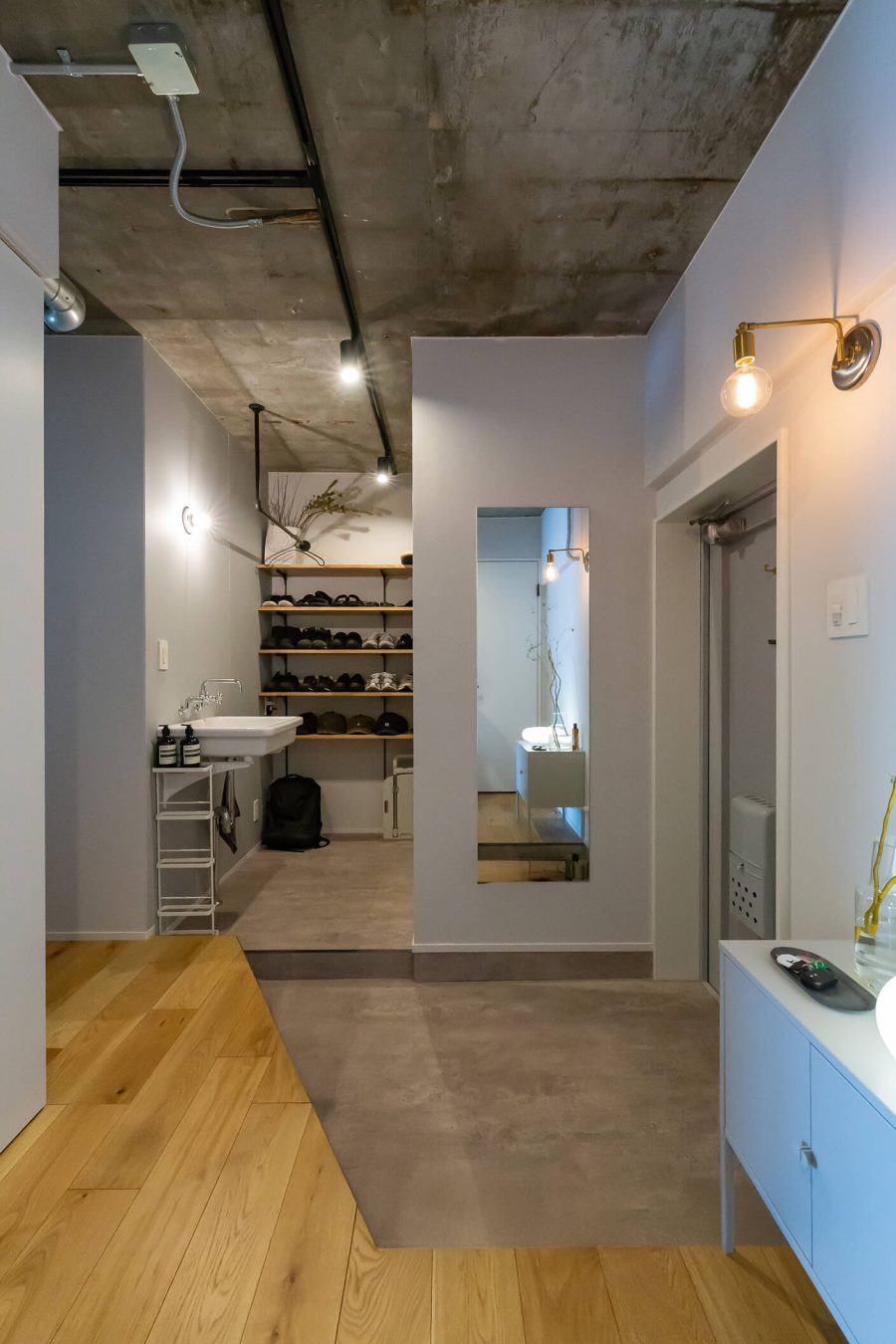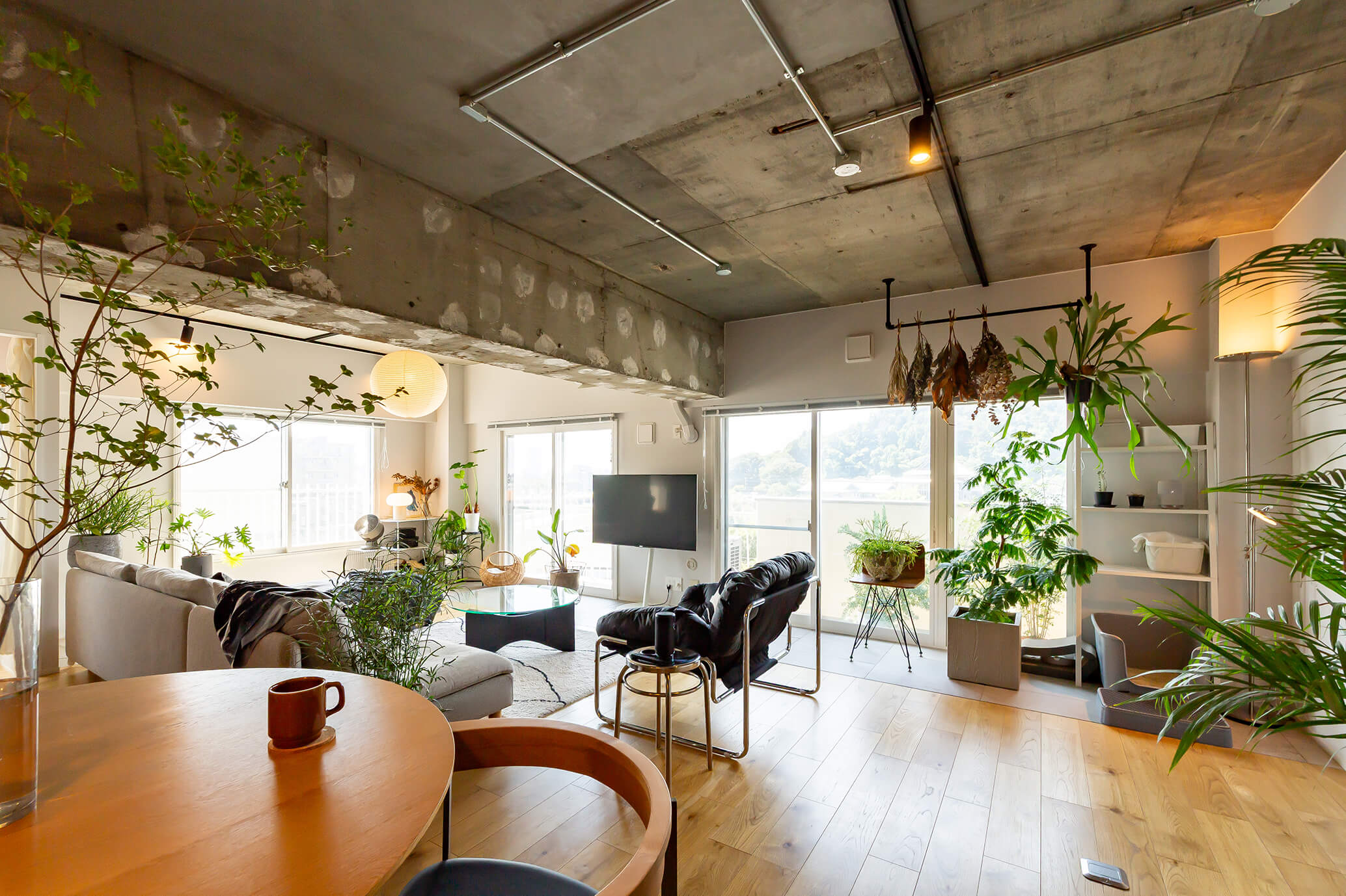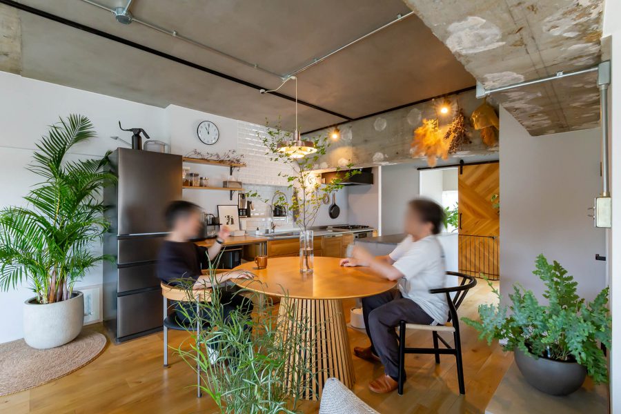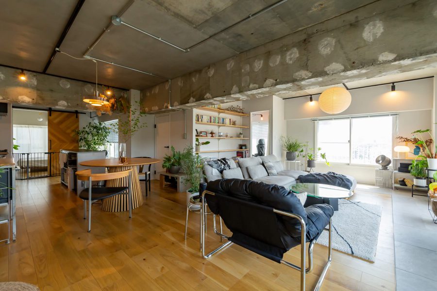 天井や梁をあえて仕上げずに残したコンクリートや露出配管がラフで無骨な雰囲気をつくり、そこにフローリングや木目のキッチンを組み合わせることで温かみをプラス。