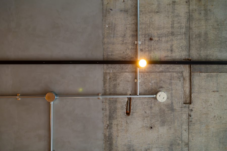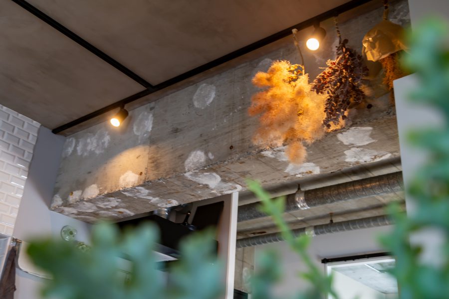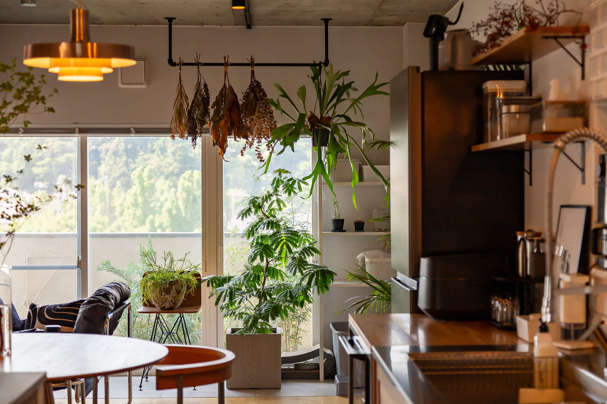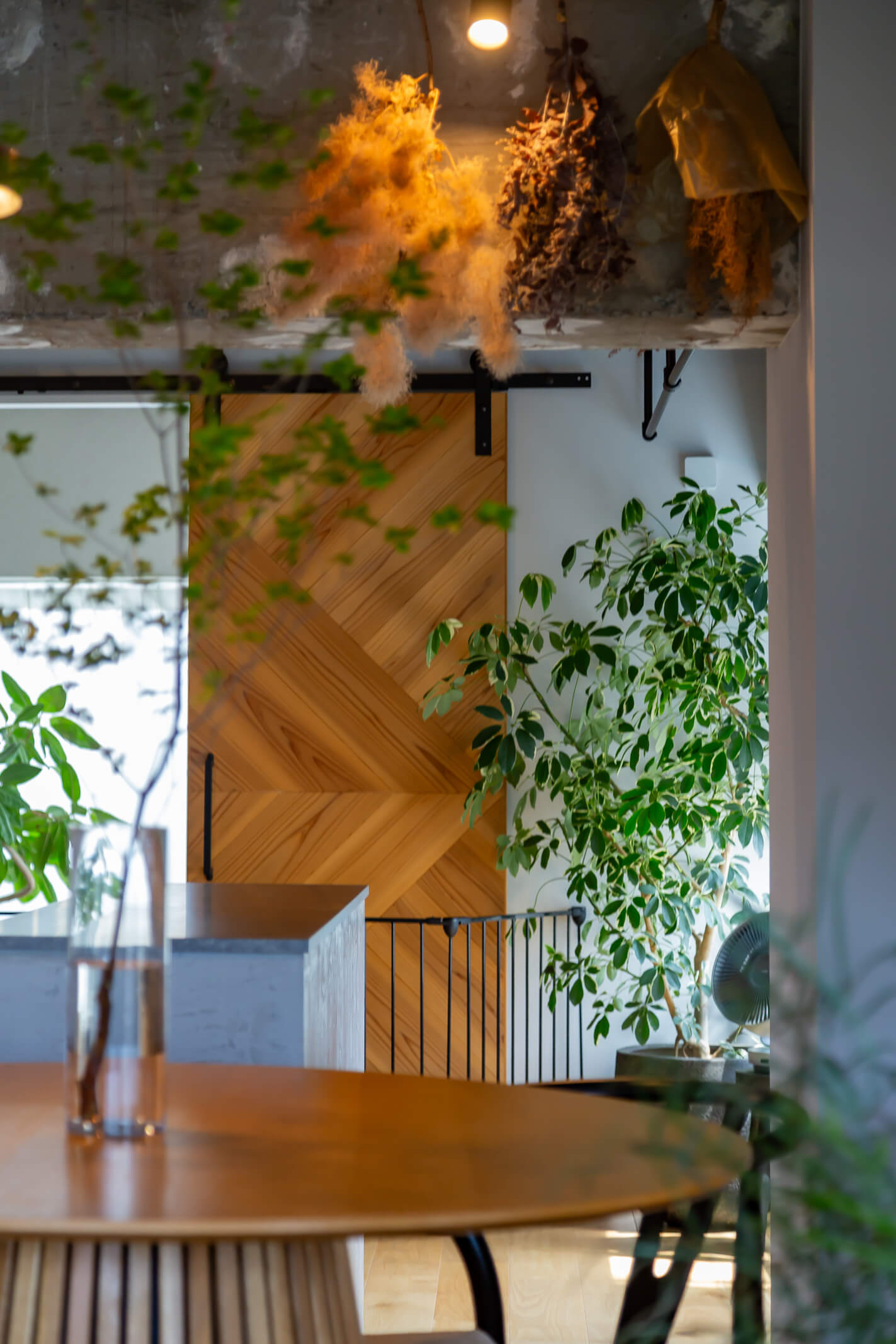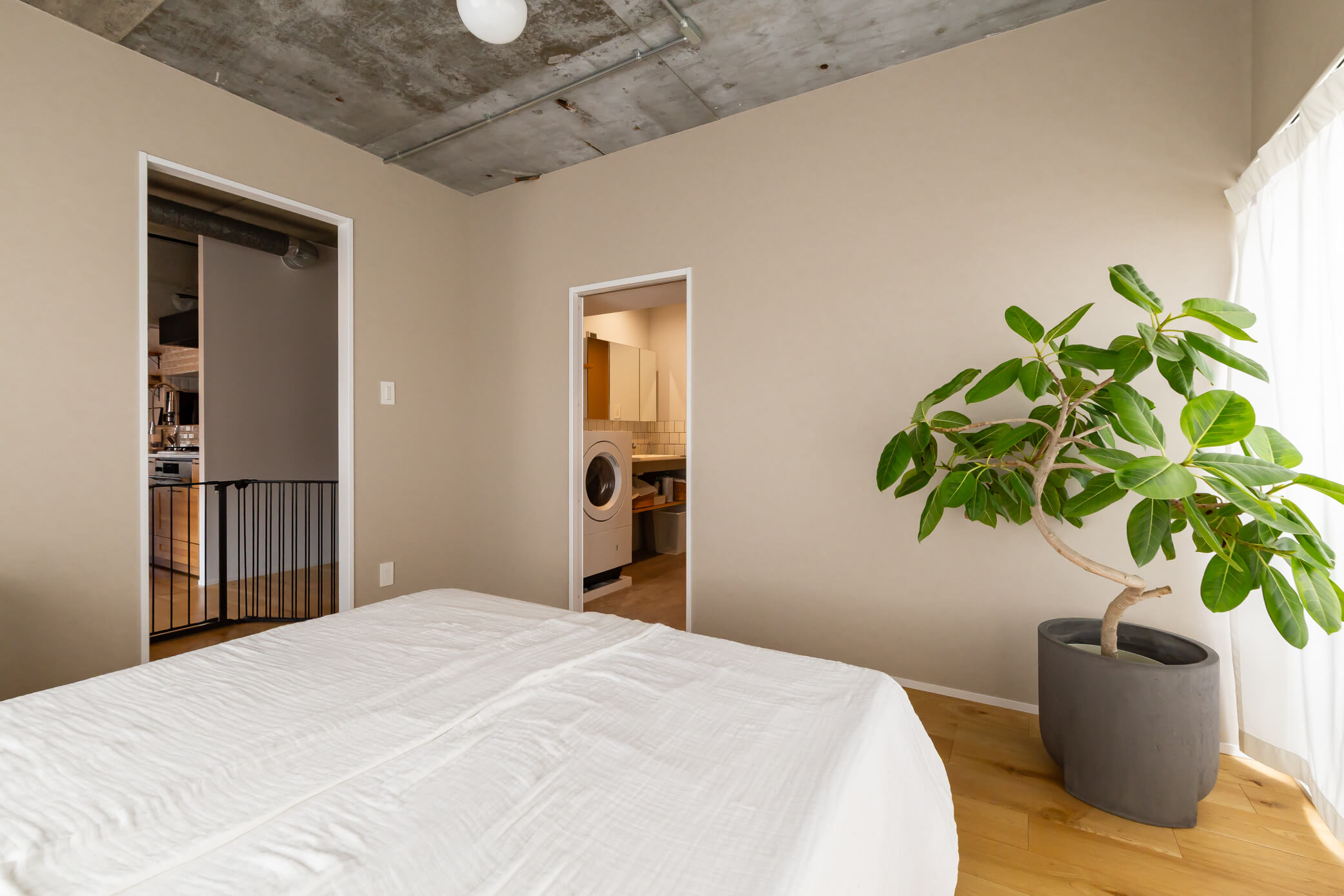 天井や梁をあえて仕上げずに残したコンクリートや露出配管がラフで無骨な雰囲気をつくり、そこにフローリングや木目のキッチンを組み合わせることで温かみをプラス。