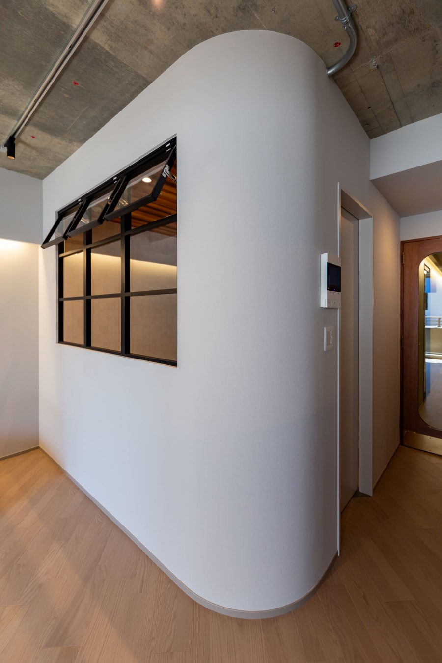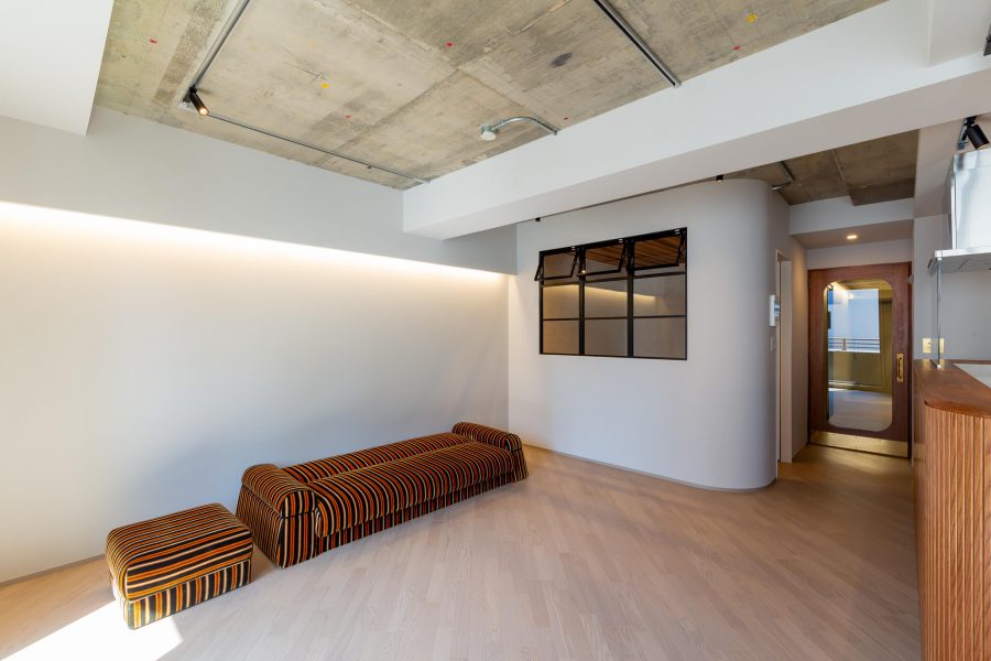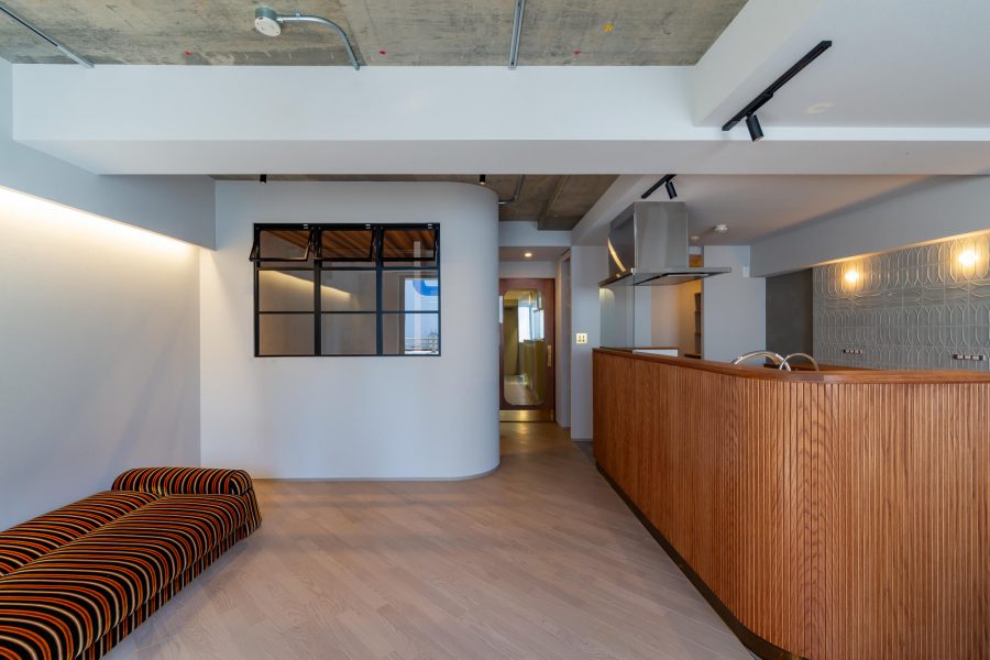 アーチ壁や間接照明、モルタル仕上げ、斜め貼りのフローリングなど、一つひとつは小さな要素ですが、それらを重ねることで、住宅でありながら店舗のような非日常感を感じられる空間を目指しました。