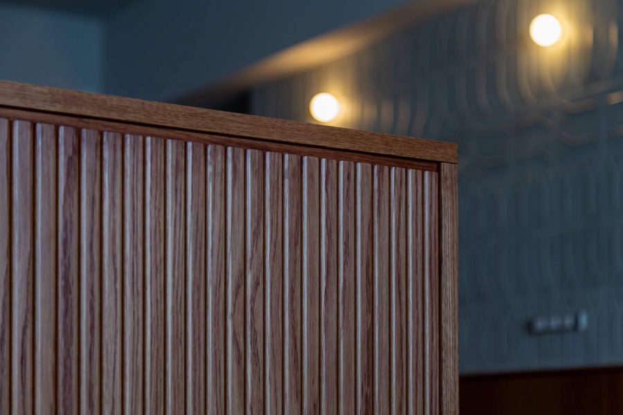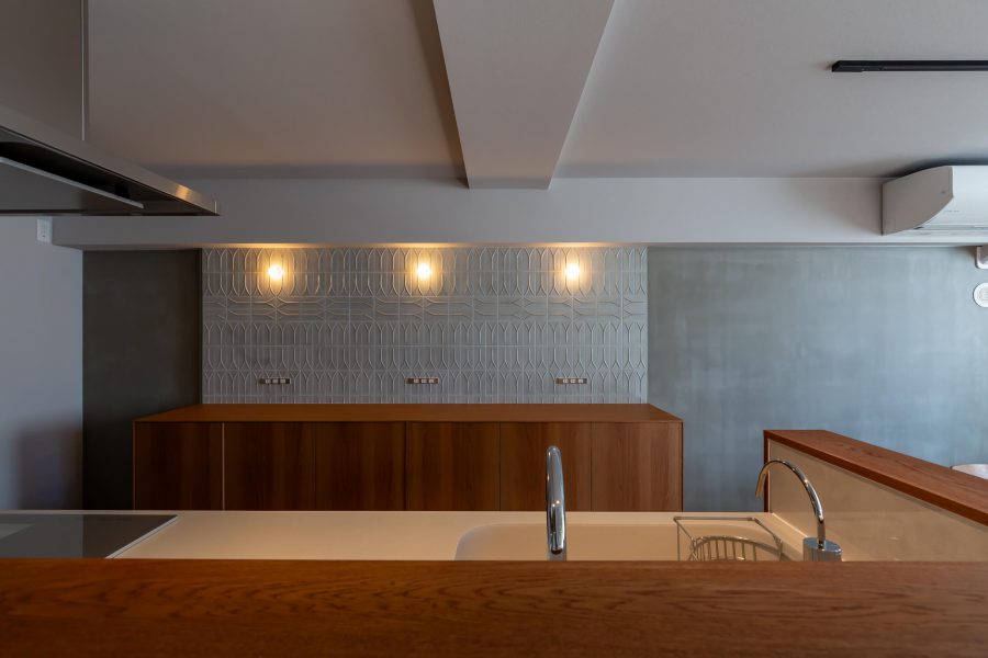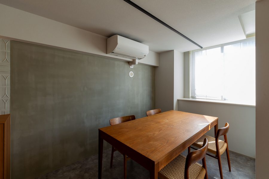 キッチンの腰壁にあしらった赤茶の木目は、フィン・ユールのダイニングセットやヴィンテージソファとも美しく調和し、空間に奥行きと統一感をもたらしています。