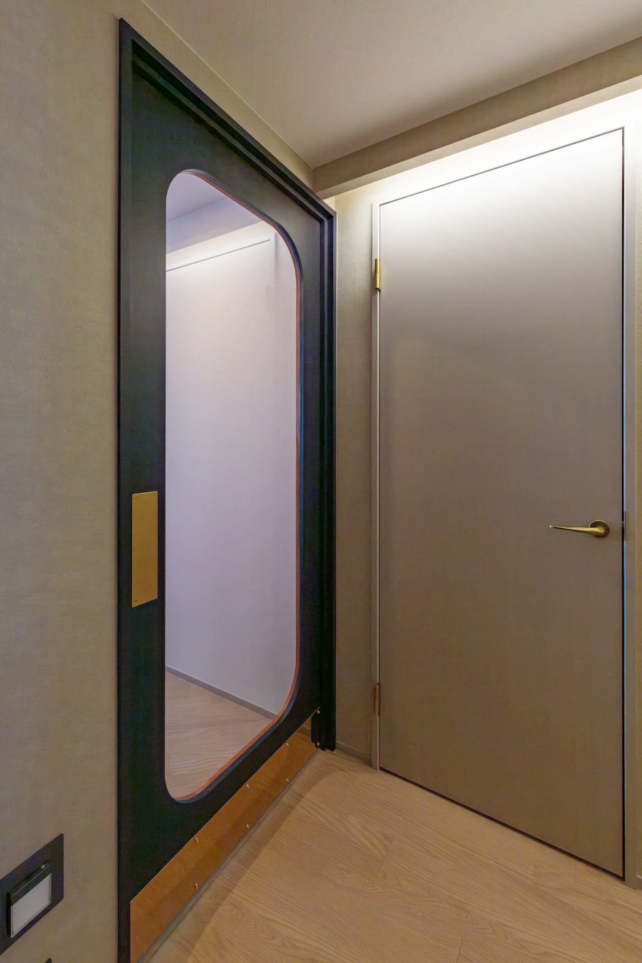リビングには造作ドアを採用し、空間全体の印象を引き締めるアクセントに仕上げました。
