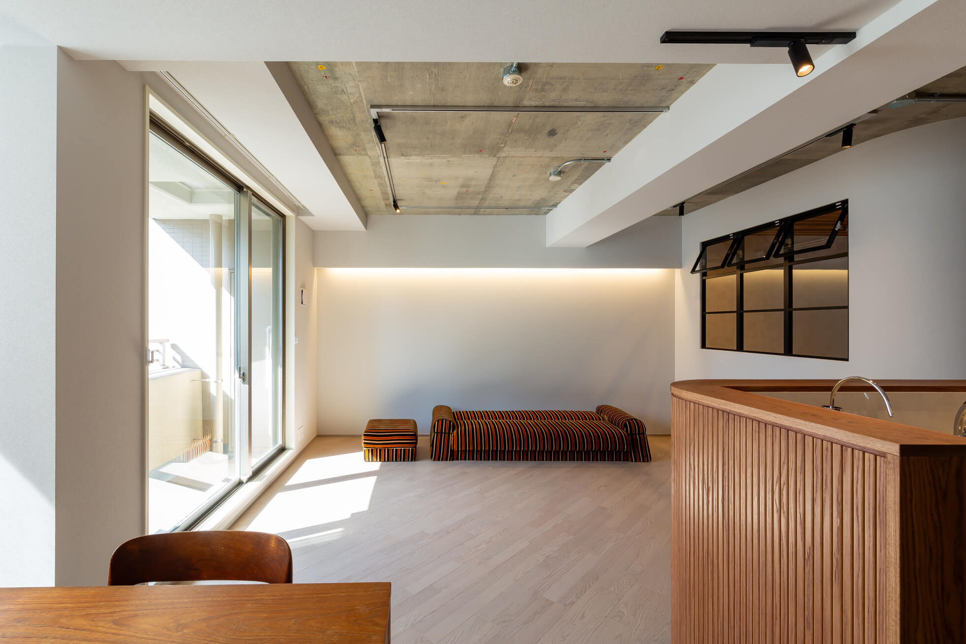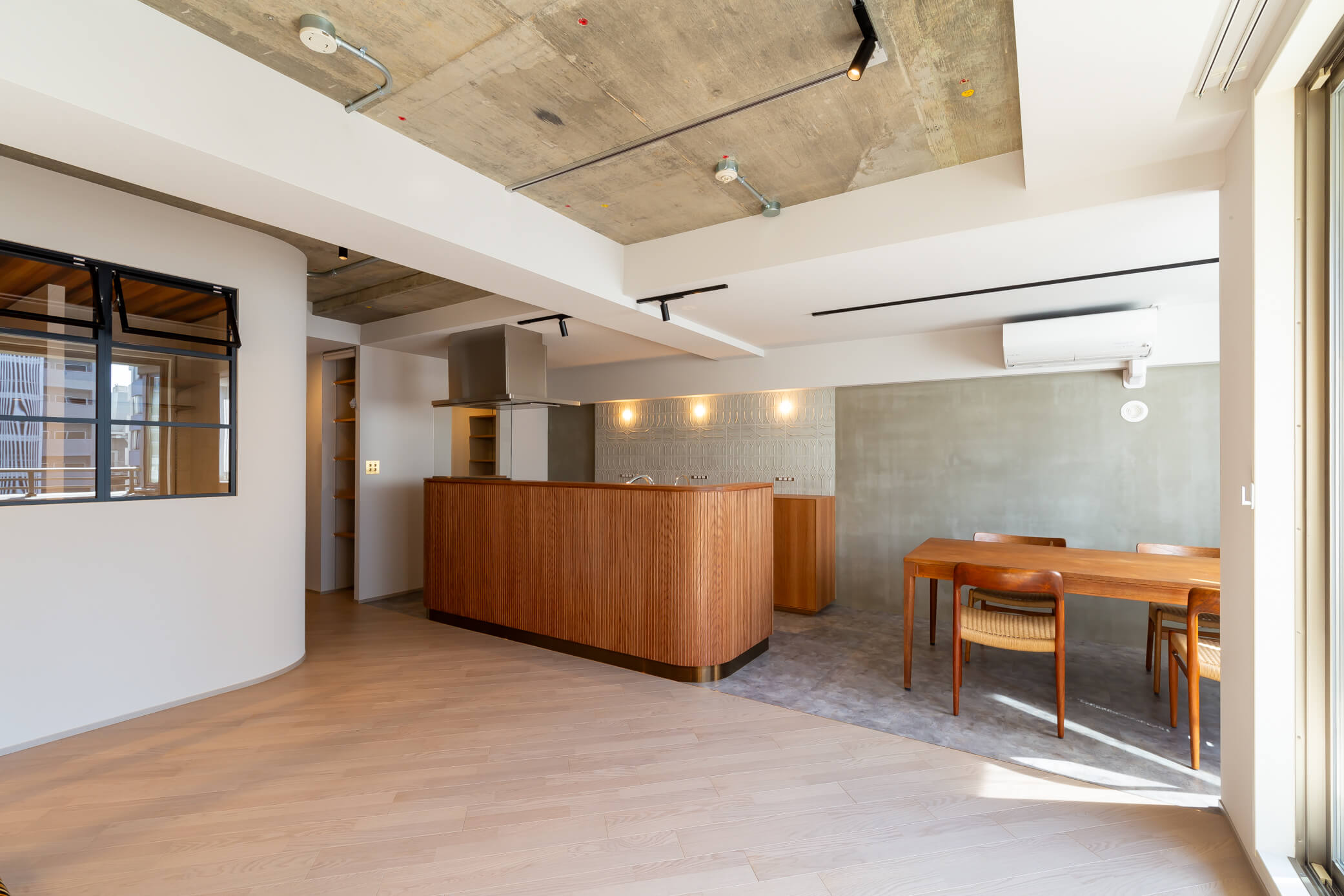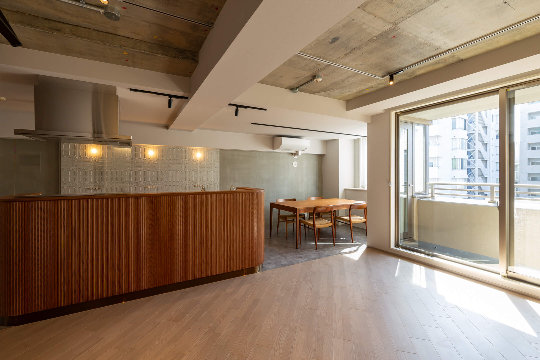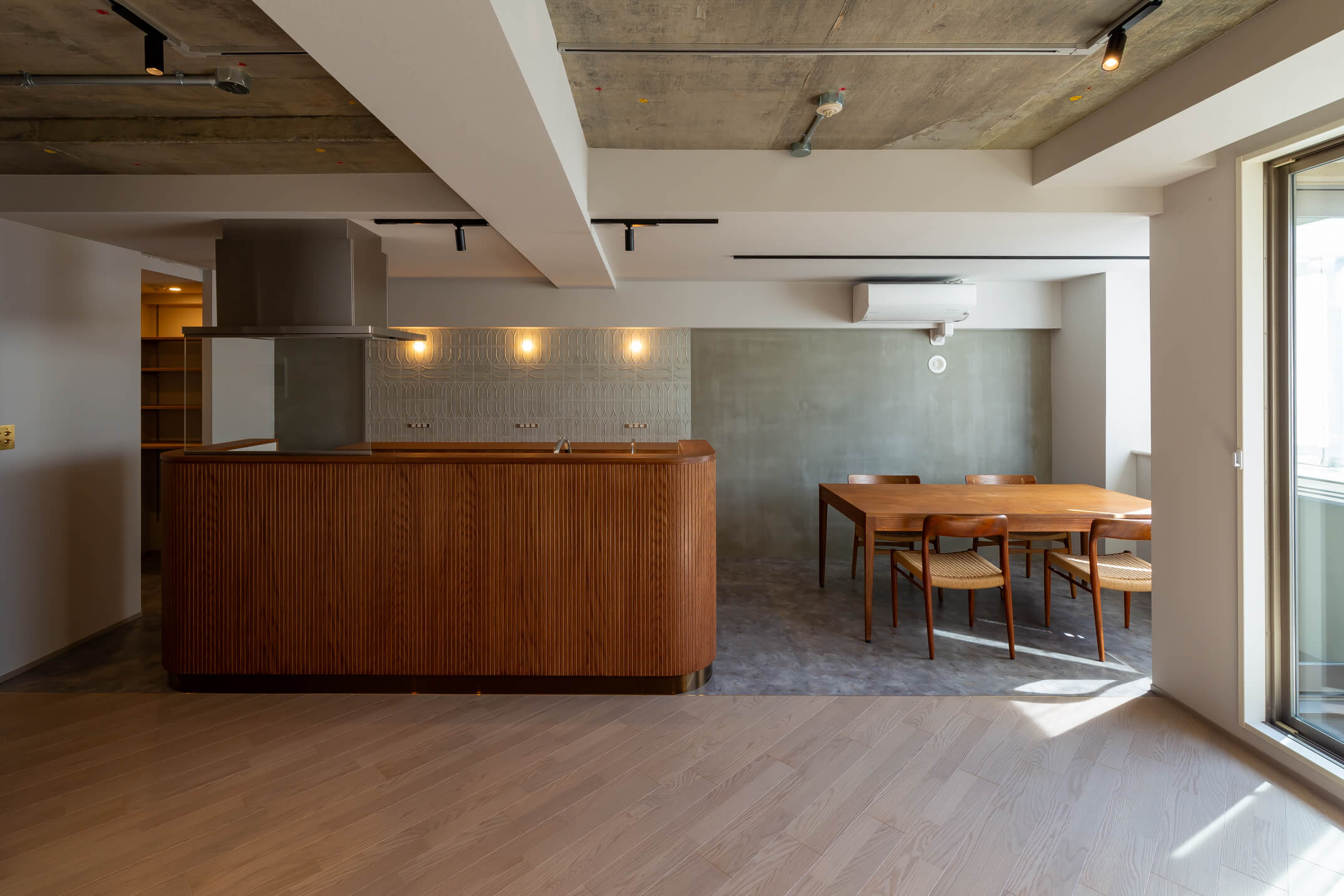 キッチンの腰壁にあしらった赤茶の木目は、フィン・ユールのダイニングセットやヴィンテージソファとも美しく調和し、空間に奥行きと統一感をもたらしています。